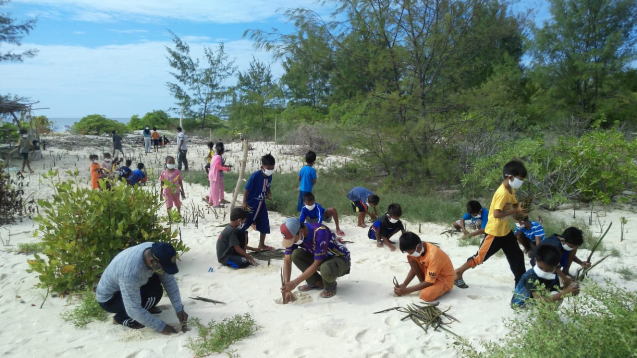 Benteng, 13 April 2021. Petugas Resort Pasitallu Timur bersama pemuda dan anak-anak yang masih duduk di bangku sekolah dasar kembali melakukan penanaman mangrove di sebelah utara Pulau Pasitallu Timur (10/4).