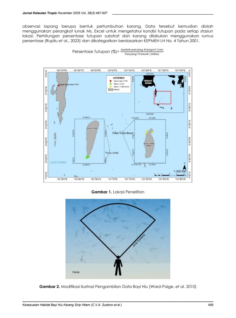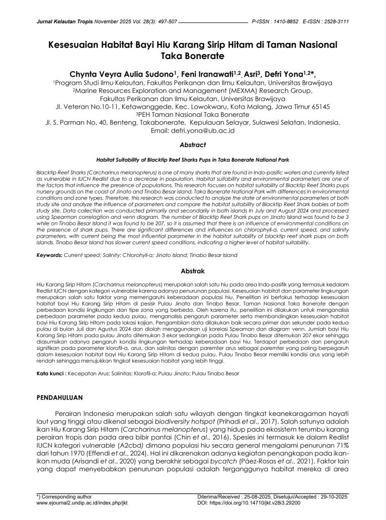 Sumber: Sudono, C.V.A., et al. (2025). Kesesuaian Habitat Bayi Hiu Karang Sirip Hitam di Taman Nasional Taka Bonerate. Jurnal Kelautan Tropis, 28(3), 497–507.