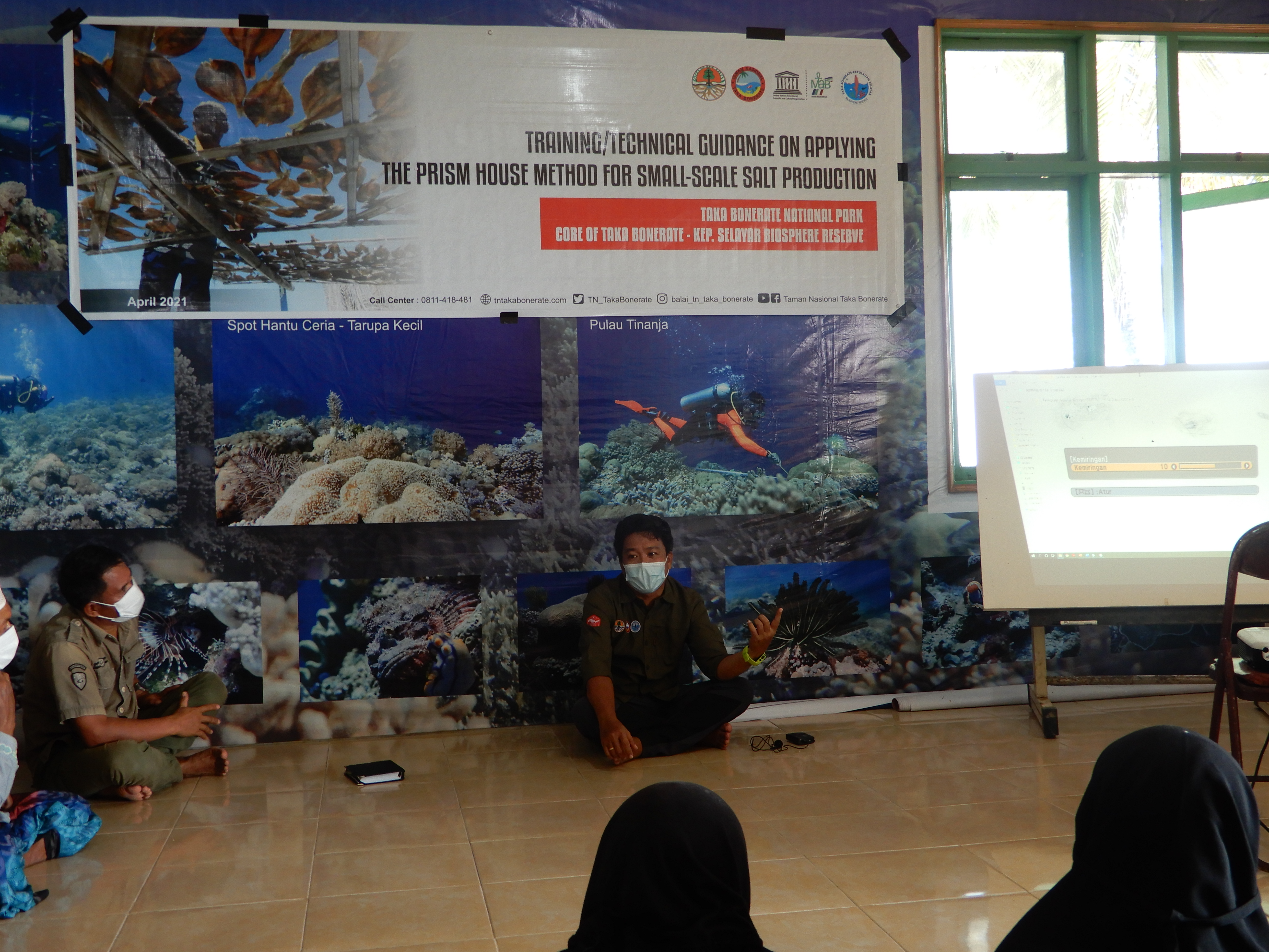 Kemudian acara dilanjutkan dengan pemberian materi oleh narasumber, dalam hal ini dibawakan oleh Penyuluh Kehutanan Balai TN Taka Bonerate, Asep Pranajaya, S.Pi. Di awal materinya, peserta diperlihatkan video proses pembuatan rumah prisma sampai dengan proses produksi garam yang dikelola oleh kelompok Forum Peduli Laut Desa Rajuni – Latondu. Tujuannya adalah peserta mendapat gambaran umum dari pelatihan ini. Kemudian acara dilanjutkan dengan sesi tanya jawab dan diskusi.